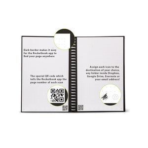 The Core/Everlast notebook provides a classic pen and paper experience, yet is built for the digital age. The Rocketbook app instantly auto-crops and digitises your pages. Send to different destinations by crossing 1 of 7 symbols at the bottom of each page.