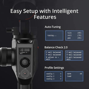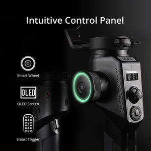 With the smart wheel, you can easily control two follow focus system as well as enable to, via camera cable, to control the camera’s follow focus (E-Focus). In Addition, you can quickly switch and control each individual axis (pan, tilt, roll) for precision movement by simply moving the smart wheel. The OLED screen provides an intuitive, bright, display of the gimbal status and camera parameters. Complete control over every detail has never been easier!